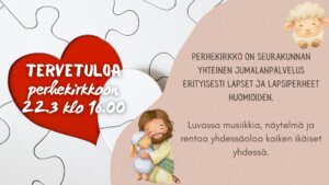 Seuraava perhekirkko on 22.3.26 klo 16.00. Ohjelman päätteeksi on maksuton mehu- ja kahvitarjoilu!